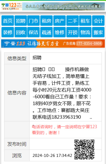 招聘 操作机器做无结子线加工,简单易懂上手容易,计件工资,熟练工每小时20元左右月工资4000-6000看自己工作量!要求:18到40岁男女不限,眼不花。工作地点:襄都路大吴庄联系电话18233963190 聘