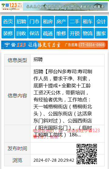 招聘【邢台N多寿司:寿司制作人员,要求干净、利索,底薪十提成+全勤奖十工龄工资2天公休,带薪培训,有经验者优先,工作地点:天一城梧桐街店(梧桐街北头)、公园东街店(达活泉东门斜对过)、公园西街店(阳光国际北门)。(临时工短期工勿扰) 18632086096信 聘