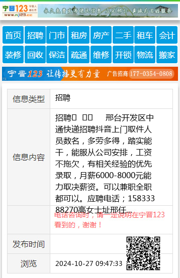 招聘 邢台开发区中通快递招聘抖音上门取件人员数名,多劳多得,踏实能干,能服从公司安排,工资不拖欠,有相关经验的优先录取,月薪6000-8000元能力取决薪资。可以兼职全职都可以。应聘电话;15833388270高女士址邢任公路北康庄中通快递。 聘