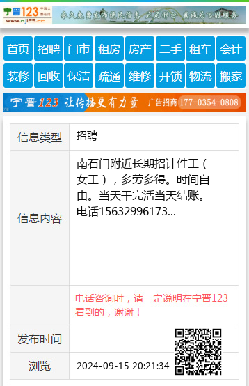 南石门附近长期招计件工(女工),多劳多得。时间自由。当天干完活当天结账。电话15632996173 【电话咨询时,请一定说明在邢台123看到的,谢谢!】 |