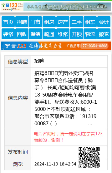 招聘🎊美团外卖江湖招募令🎊合作送餐员(骑手) 长期/短期均可要求:满18-50周岁会骑电车会用智能手机。配送费收入:6000-15000上不封顶配送区域 :邢台市区联系电话:19131900087() 聘