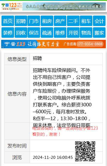 招聘纯车险续保顾问。不外出不用自己找客户,公司提供快到期客户,主要负责客户车险报价,办理续保服务,使用公司电脑外呼系统拨打联系客户。综合薪资3000–6000元,每月准时发放。 8点半—12,13:30–18:00,周末休息,法定节假日带薪休假,缴纳五险一金。地址:邢台开发区河北工业大学科技园,张女士17633088862 聘 |