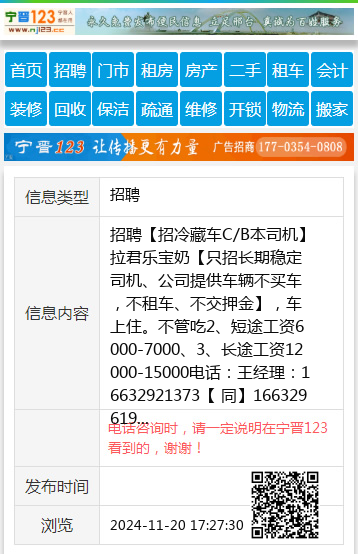 招聘【招冷藏车C/B本司机】拉君乐宝奶【只招长期稳定司机、公司提供车辆不买车,不租车、不交押金】,车上住。不管吃2、短途工资6000-7000、3、长途工资12000-15000电话:王经理:16632921373【 同】16632961920【 同】 聘