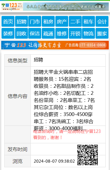 招聘大芊金火锅串串二店招聘服务员:15名迎宾:2名收银员:2名甜品制作员:2名油炸小吃:2名切配工:2名份菜岗 :2名串菜工:7名其它杂工岗位:数名以上岗位综合薪资:3500-4500穿串工:7名洗碗工:3名综合薪资:3000-4000福利:包吃住+月带薪休假3天+工龄工资+节日福利+生日福利面试地址:守敬南路永辉花园底商大芊金电话:15713191341 聘 |