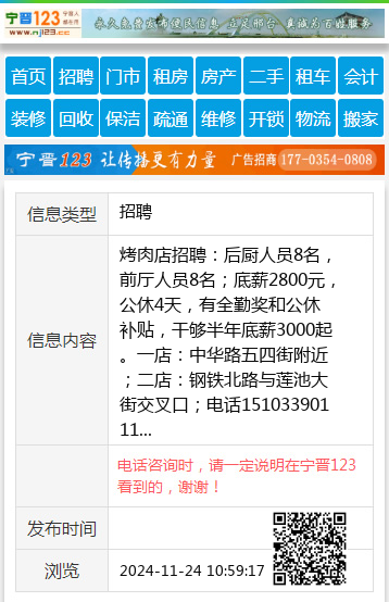 烤肉店招聘:后厨人员8名,前厅人员8名;底薪2800元,公休4天,有全勤奖和公休补贴,干够半年底薪3000起。一店:中华路五四街附近;二店:钢铁北路与莲池大街交叉口;电话15103390111