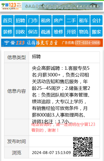 央企高薪诚聘:1.客服专员5名:月薪3000+,负责公司相关活动告知和售后服务,年龄25--45周岁;2.储备主管2名:负责团队相关事务管理、绩效追踪,大专以上学历,有销售经验可放宽条件,月薪8000起3.人事助理两名、讲师1名注:1.7小时工作制,周末双休 2.养老医疗保障 3.系统培训机制,晋升空间大;国企招聘一辈子有保障 15830726364 |