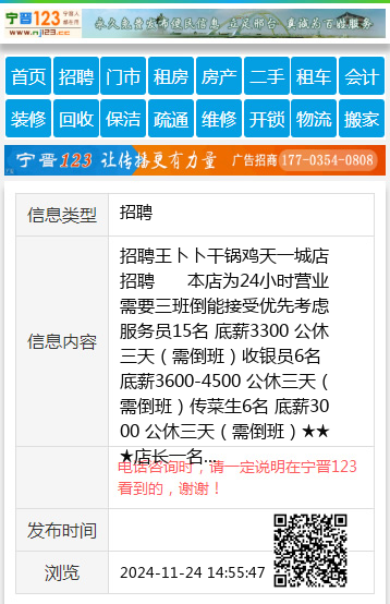 招聘王卜卜干锅鸡天一城店招聘 本店为24小时营业需要三班倒能接受优先考虑服务员15名 底薪3300 公休三天(需倒班)收银员6名 底薪3600-4500 公休三天(需倒班)传菜生6名 底薪3000 公休三天(需倒班)★★★店长一名 工资面议炒锅厨师5名 6000-6500没公休(需倒班)凉菜厨师3名 4500-5000没公休(需倒班)切配5名 4500-5500没公休(需倒班)洗碗洗菜工8名 3000公休四天(需倒班)钟点工上午9-2点50一天 下午5-10点55一天 晚上 10-3点 60一天,每个时间点需要3名周六周日假期工12名100一天,只要勤工俭学大学生以上人员可在根据个人具体能力在合适范围浮动工资和公休具体详谈!本店包吃住联系电话13031914444 聘 |