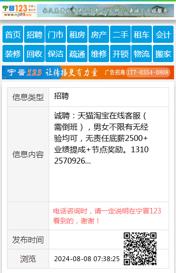诚聘:天猫淘宝在线客服(需倒班),男女不限有无经验均可,无责任底薪2500+业绩提成+节点奖励。13102570926