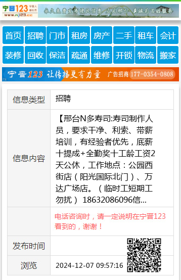 【邢台N多寿司:寿司制作人员,要求干净、利索、带薪培训,有经验者优先,底薪十提成+全勤奖十工龄工资2天公休,工作地点:公园西街店(阳光国际北门)、万达广场店。(临时工短期工勿扰) 18632086096信
