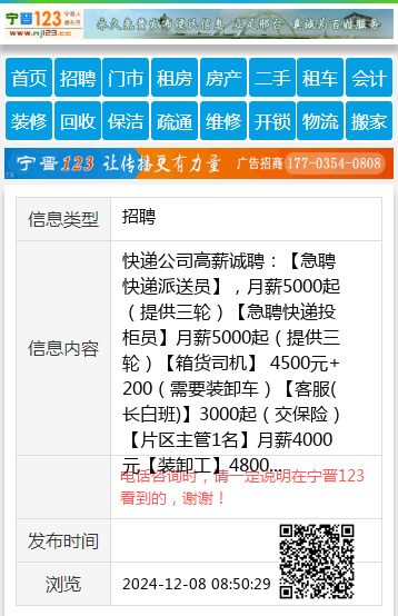 快递公司高薪诚聘:【急聘快递派送员】,月薪5000起(提供三轮)【急聘快递投柜员】月薪5000起(提供三轮)【箱货司机】 4500元+200(需要装卸车)【客服(长白班)】3000起(交保险)【片区主管1名】月薪4000元【装卸工】4800➕200全勤地址:西沙窝村西, 联系电话:18131968572、156 12967286(同 ) |