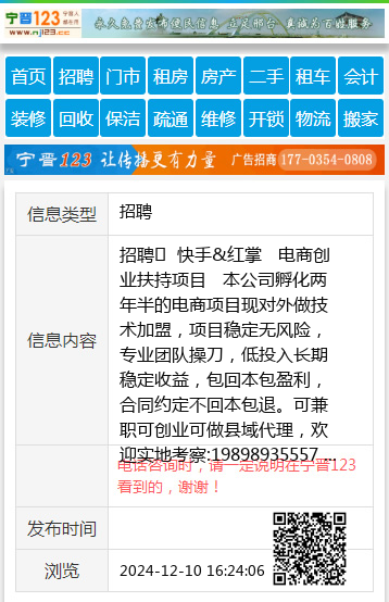 招聘 快手&红掌 电商创业扶持项目 本公司孵化两年半的电商项目现对外做技术加盟,项目稳定无风险,专业团队操刀,低投入长期稳定收益,包回本包盈利,合同约定不回本包退。可兼职可创业可做县域代理,欢迎实地考察:19898935557 15533602619 聘