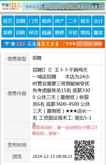 招聘 王卜卜干锅鸡天一城店招聘 本店为24小时营业需要三班倒能接受优先考虑服务员15名 底薪3300 公休三天(需倒班)收银员6名 底薪3600-4500 公休三天(需倒班)★★★店长一名 工资面议周末工: 周五5-10点50一天 周六9-2 5-10点100一天 周日9-2 5-10点 100一天【需要长期稳定临时几天不要】以上人员可在根据个人具体能力在合适范围浮动工资和公休具体详谈!本店包吃住联系电话13031914444 聘 |