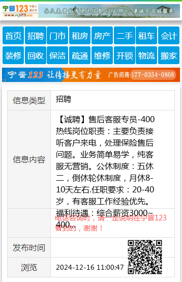 【诚聘】售后客服专员-400热线岗位职责:主要负责接听客户来电,处理保险售后问题。业务简单易学,纯客服无营销。公休制度:五休二,倒休轮休制度,月休8-10天左右.任职要求:20-40岁,有客服工作经验优先。福利待遇:综合薪资3000~4000 电话:15030486772地址:邢台襄都区爱特园