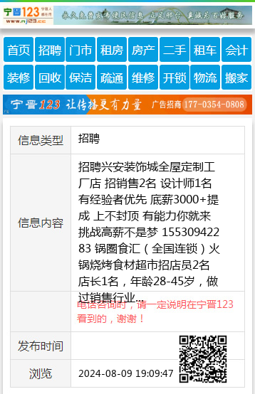 招聘兴安装饰城全屋定制工厂店 招销售2名 设计师1名 有经验者优先 底薪3000+提成 上不封顶 有能力你就来 挑战高薪不是梦 15530942283 锅圈食汇(全国连锁)火锅烧烤食材超市招店员2名 店长1名,年龄28-45岁,做过销售行业者优先,工资3-6千18931911899 聘