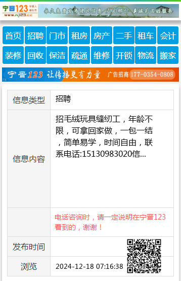 招毛绒玩具缝纫工,年龄不限,可拿回家做,一包一结,简单易学,时间自由,联系电话:15130983020信