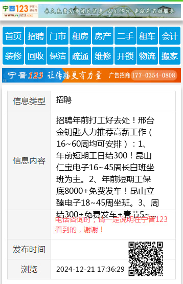 招聘年前打工好去处!邢台金钥匙人力推荐高薪工作(16~60周均可安排):1、年前短期工日结300!昆山仁宝电子16~45周长白班坐班为主。2、年前短期工保底8000+免费发车!昆山立臻电子18~45周坐班。3、周结300+免费发车+春节5~7千奖励。上海得物名鞋包仓18~38周坐班。4、357元/天!昆山龙腾光电16~35周年后须返厂。5、日结白班170夜班200!石家庄邮政小件仓18~55男工。6、日结209+奖励!天津力神电子18~38周。7、日结220~240,天津长城线束17~35周。8、400元/天,芜湖奇瑞18~40周男。更多工作欢迎加 看朋友圈:15530901546 聘 |