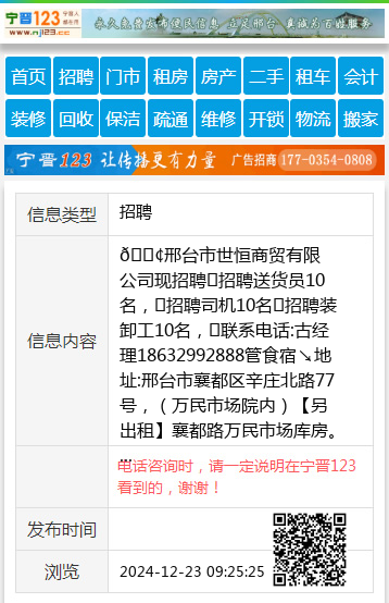 📢邢台市世恒商贸有限公司现招聘✅招聘送货员10名,✅招聘司机10名✅招聘装卸工10名,✳联系电话:古经理18632992888管食宿↘地址:邢台市襄都区辛庄北路77号,(万民市场院内)【另出租】襄都路万民市场库房。