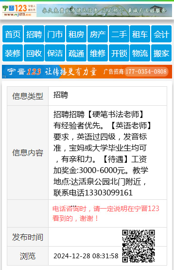 招聘招聘【硬笔书法老师】有经验者优先。【英语老师】要求,英语过四级,发音标准,宝妈或大学毕业生均可,有亲和力。【待遇】工资加奖金:3000-6000元。教学地点:达活泉公园北门附近,联系电话13303099161 聘