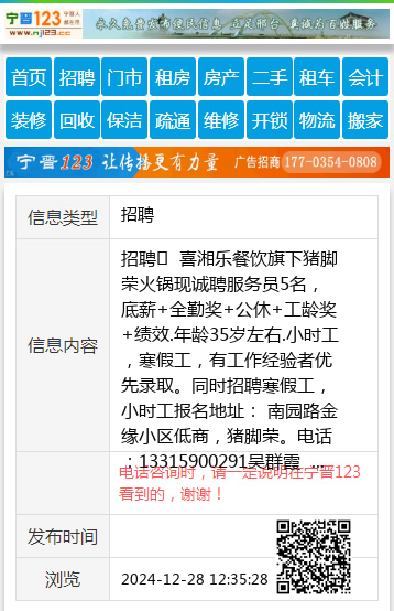 招聘 喜湘乐餐饮旗下猪脚荣火锅现诚聘服务员5名,底薪+全勤奖+公休+工龄奖+绩效.年龄35岁左右.小时工,寒假工,有工作经验者优先录取。同时招聘寒假工,小时工报名地址: 南园路金缘小区低商,猪脚荣。电话:13315900291吴群霞 聘