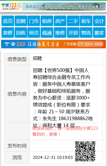 招聘【世界500强】中国人寿招聘综合金融专员工作内容:服务中国人寿星级客户,做好基础和综拓服务,服务为中心薪资:底薪3000+绩效提成(职位有限)要求:年龄 21~50 周岁联系方式:朱先生 18631988862地址:保利大厦 14 层 聘
