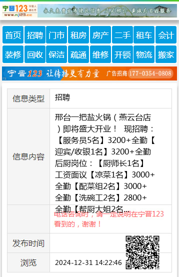 邢台一把盐火锅(燕云台店)即将盛大开业! 现招聘:【服务员5名】3200+全勤【迎宾/收银1名】3200+全勤后厨岗位:【厨师长1名】工资面议【凉菜1名】3000+全勤【配菜组2名】3000+全勤【洗碗工2名】2800+全勤【帮厨大姐2名】3000+全勤待遇:门店负责食宿、每月公休3天、工龄奖、每月聚餐、工资准时发放!☎:路店长15833675733地点:燕云台小区南门 |