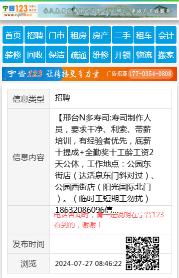 【邢台N多寿司:寿司制作人员,要求干净、利索、带薪培训,有经验者优先,底薪十提成+全勤奖十工龄工资2天公休,工作地点:公园东街店(达活泉东门斜对过)、公园西街店(阳光国际北门)。(临时工短期工勿扰) 18632086096信