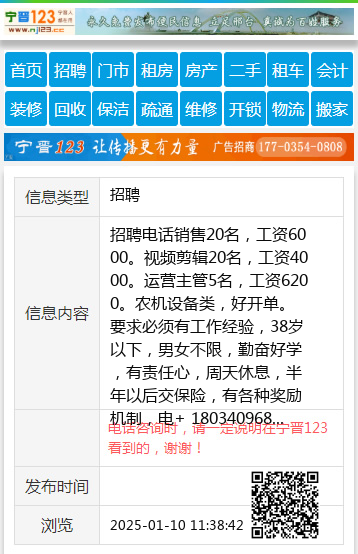 招聘电话销售20名,工资6000。视频剪辑20名,工资4000。运营主管5名,工资6200。农机设备类,好开单。要求必须有工作经验,38岁以下,男女不限,勤奋好学,有责任心,周天休息,半年以后交保险,有各种奖励机制,电+ 18034096855~另招聘tiktok运营5名,必须会英语。待遇优厚。地址一:金凯利商贸城地址二:景家屯村 |