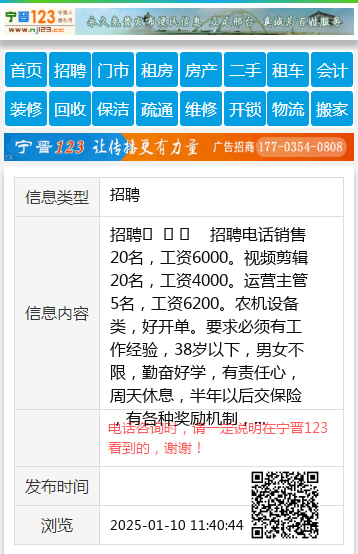 招聘 招聘电话销售20名,工资6000。视频剪辑20名,工资4000。运营主管5名,工资6200。农机设备类,好开单。要求必须有工作经验,38岁以下,男女不限,勤奋好学,有责任心,周天休息,半年以后交保险,有各种奖励机制,电+ 18034096855~另招聘tiktok运营5名,必须会英语。待遇优厚。地址一:金凯利商贸城地址二:景家屯村 聘 |