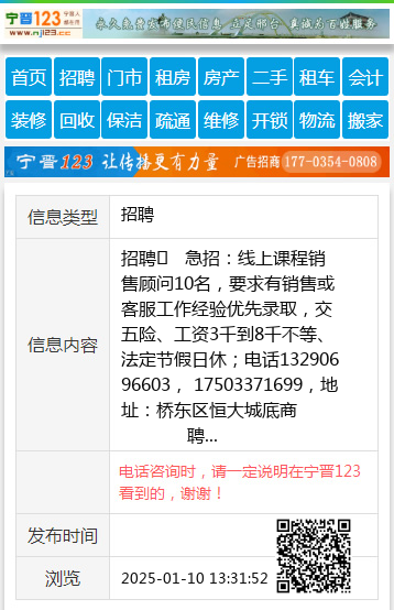 招聘 急招:线上课程销售顾问10名,要求有销售或客服工作经验优先录取,交五险、工资3千到8千不等、法定节假日休;电话13290696603, 17503371699,地址:桥东区恒大城底商 聘