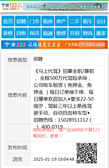 《马上代驾》招募全职/兼职, 全程500万代驾险承保,公司电车租赁(免押金、免押金 )每日订单接不停、每日爆单欢迎加入◆要求22-50周岁,驾龄三年以上熟练驾驶手动、自动挡各种车型◆招聘热线:15028911112( ) 400-0319-717 地址:中华路168号(一中对面58家政二楼)