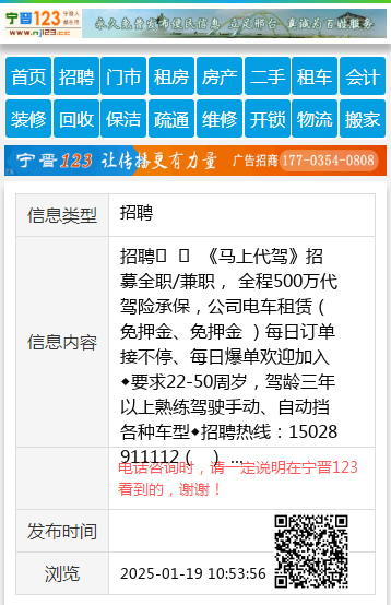 招聘 《马上代驾》招募全职/兼职, 全程500万代驾险承保,公司电车租赁(免押金、免押金 )每日订单接不停、每日爆单欢迎加入◆要求22-50周岁,驾龄三年以上熟练驾驶手动、自动挡各种车型◆招聘热线:15028911112( ) 400-0319-717 地址:中华路168号(一中对面58家政二楼) 聘