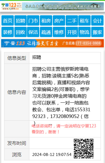 招聘公司主营俄罗斯跨境电商,招聘:读稿主播5名(熟悉后需脱稿),直播和视频内容文案编辑2名(可兼职),想学习无货源0押金跨境电商的也可以联系,一对一陪跑包教会、包出单,电话15533192323,17320809052(信) 聘