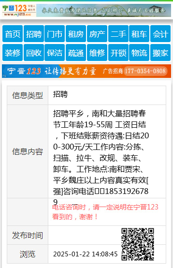 招聘平乡,南和大量招聘春节工年龄19-55周 工资日结,下班结账薪资待遇:日结200-300元/天工作内容:分拣、扫描、拉牛、改规、装车、卸车。工作地点:南和贾宋、平乡魏庄以上内容真实有效[强]咨询电话☎️18531926789 聘
