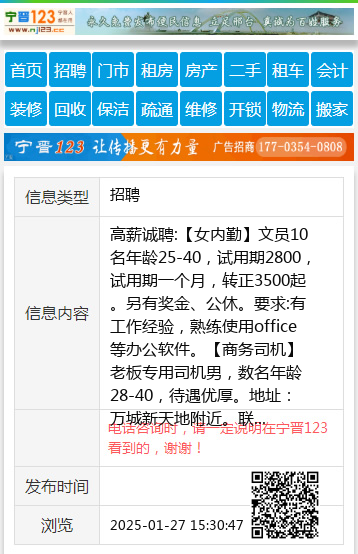 高薪诚聘:【女内勤】文员10名年龄25-40,试用期2800,试用期一个月,转正3500起。另有奖金、公休。要求:有工作经验,熟练使用office等办公软件。【商务司机】老板专用司机男,数名年龄28-40,待遇优厚。地址:万城新天地附近。联系电话:17803191888。