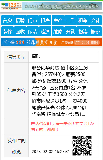 电话咨询时,请一定说明在邢台123看到的,谢谢! |
