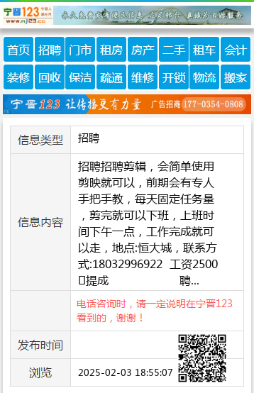 招聘招聘剪辑,会简单使用剪映就可以,前期会有专人手把手教,每天固定任务量,剪完就可以下班,上班时间下午一点,工作完成就可以走,地点:恒大城,联系方式:18032996922 工资2500➕提成 聘