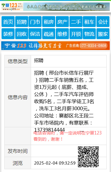 招聘(邢台市长信车行展厅)招聘二手车销售五名,工资1万元起(底薪、提成、公休),二手车汽车评估师收购5名,二手车学徒工3名,洗车工3名月薪3000元。公司地址:襄都区北王段二手车市场院内,有意联系:13739814444 聘