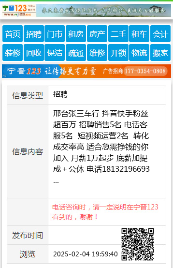 邢台张三车行 抖音快手粉丝超百万 招聘销售5名 电话客服5名 短视频运营2名 转化成交率高 适合急需挣钱的你加入 月薪1万起步 底薪加提成+公休 电话18132196693
