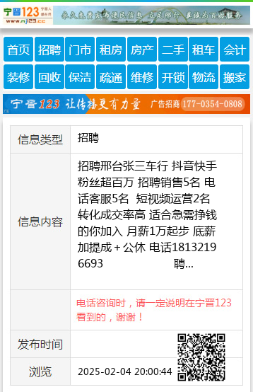 招聘邢台张三车行 抖音快手粉丝超百万 招聘销售5名 电话客服5名 短视频运营2名 转化成交率高 适合急需挣钱的你加入 月薪1万起步 底薪加提成+公休 电话18132196693 聘