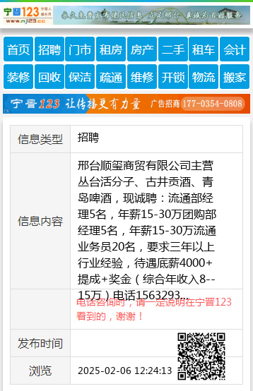 邢台顺玺商贸有限公司主营丛台活分子、古井贡酒、青岛啤酒,现诚聘:流通部经理5名,年薪15-30万团购部经理5名,年薪15-30万流通业务员20名,要求三年以上行业经验,待遇底薪4000+提成+奖金(综合年收入8--15万)电话15632933999( )