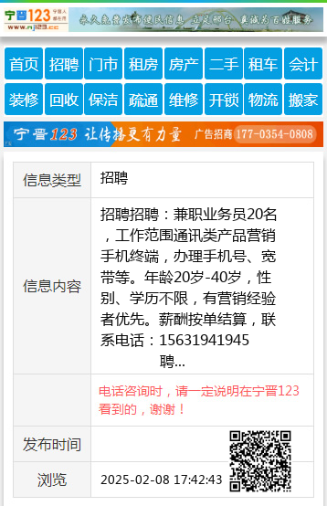 招聘招聘:兼职业务员20名,工作范围通讯类产品营销 手机终端,办理手机号、宽带等。年龄20岁-40岁,性别、学历不限,有营销经验者优先。薪酬按单结算,联系电话:15631941945 聘