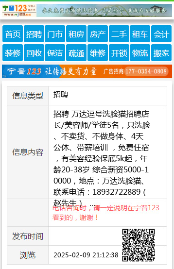招聘 万达逗号洗脸猫招聘店长/美容师/学徒5名,只洗脸、不卖货、不做身体、4天公休、带薪培训 ,免费住宿,有美容经验保底5k起,年龄20-38岁 综合薪资5000-10000,地点:万达洗脸猫、联系电话:18932722889(赵先生) 聘