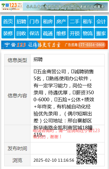✅五金商贸公司,✅诚聘销售5名,✅熟练使用办公软件,有一定学习能力,岗位一经录用,待遇优厚,✅薪资3500-6000,✅五险+公休+绩效+年终奖,有机械自动化经验优先录用,(偶尔短期出差)公司地址:邢台襄都区新华南路金凯利商贸城18幢119室,张先生18732967890