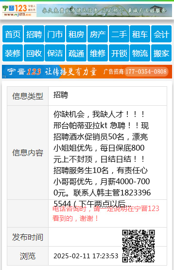 你缺机会,我缺人才!!!邢台帕蒂亚拉kt 急聘!!现招聘酒水促销员50名,漂亮小姐姐优先,每日保底800元上不封顶,日结日结!!招聘服务生10名,有责任心小哥哥优先,月薪4000-7000元。联系人韩主管18233965544(下午两点以后联系)