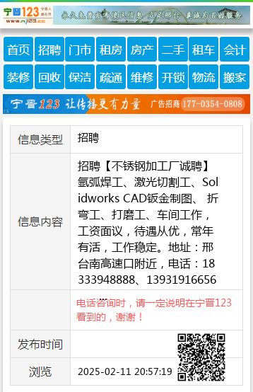 招聘【不锈钢加工厂诚聘】氩弧焊工、激光切割工、Solidworks CAD钣金制图、 折弯工、打磨工、车间工作,工资面议,待遇从优,常年有活,工作稳定。地址:邢台南高速口附近,电话:18333948888、13931916656 聘