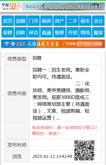 招聘一:招生老师。兼职全职均可。待遇面谈。 二:化妆师、美甲美睫师、摄影师、美发师。底薪3000➕提成三:网络策划部主管(待遇面谈),文案、视频剪辑、短视频运营(待遇面谈)。 四:文员,要求20岁以上。(待遇面谈)。 五:摄影,美发,化妆学徒。 联系电话17734505557 信同步 聘