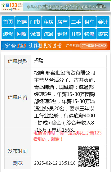 招聘 邢台顺玺商贸有限公司主营丛台活分子、古井贡酒、青岛啤酒,现诚聘:流通部经理5名,年薪15-30万团购部经理5名,年薪15-30万流通业务员20名,要求三年以上行业经验,待遇底薪4000+提成+奖金(综合年收入8--15万)电话15632933999( 信 ) 聘