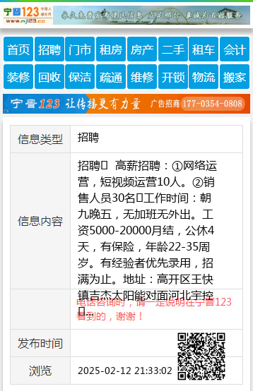 招聘 高薪招聘:①网络运营,短视频运营10人。②销售人员30名✅工作时间:朝九晚五,无加班无外出。工资5000-20000月结,公休4天,有保险,年龄22-35周岁。有经验者优先录用,招满为止。地址:高开区王快镇吉杰太阳能对面河北宇控✅电话:18832976656王经理(同 ) 聘