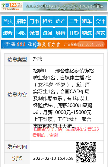 招聘 邢台惠亿家装饰招聘业务1名,自媒体主播2名(女20岁-45岁),设计师实习生1名,会画CAD布局及制作酷家乐,有1年以上经验优先,底薪3000加高提成,月薪10000元-15000元上不封顶,工作地址:邢台市襄都区泉北大街新眼科医院西邻,联系电话:16632967999张经理 聘