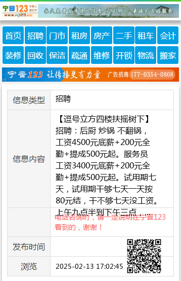 【逗号立方四楼扶摇树下】招聘:后厨 炒锅 不翻锅,工资4500元底薪+200元全勤+提成500元起。服务员 工资3400元底薪+200元全勤+提成500元起。试用期七天,试用期干够七天一天按80元结,干不够七天没工资。上午九点半到下午三点,下午五点到晚上十点。公休三天。包吃住。每月平优奖100元。有工龄奖。电话:19331987407 王 |
